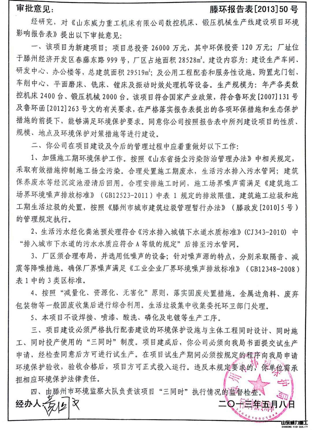 (2)滕州市環(huán)境保護局對山東威力重工機床有限公司數(shù)控機床、鍛壓機械生產(chǎn)線建設(shè)項目的審批意見(滕環(huán)報告表[2013]50 號 2013.5.8)