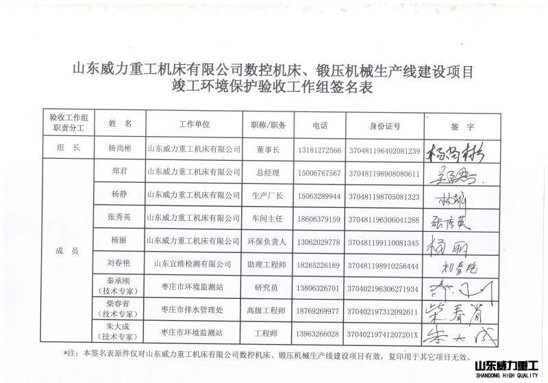 2018 年 6 月 10 日,山東威力重工機床有限公司在滕州市經(jīng)濟開發(fā)區(qū)組織召開“山東威力重工機床有限公司數(shù)控機床、鍛壓機械生產(chǎn)線建設(shè)”項目竣工環(huán)境保護驗收會,參加會議的有:驗收監(jiān)測報告編制機構(gòu)—山東宜維檢測有限公司的代表和三名專業(yè)技術(shù)專家,會議成立了驗收工作組(成員名單附后)。